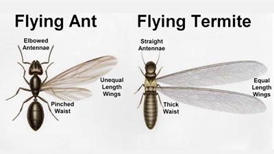 Winged ants may also swarm this time of year. By examining the insect you can determine whether it’s a termite or an ant. Termites have straight antennae; ants have elbowed antennae. Also, termites have uniform waists; ants have constricted waists between body regions. Termites have two pairs of wings of equal size. Ants also have two pairs of wings, but the forewings are longer than the hindwings.