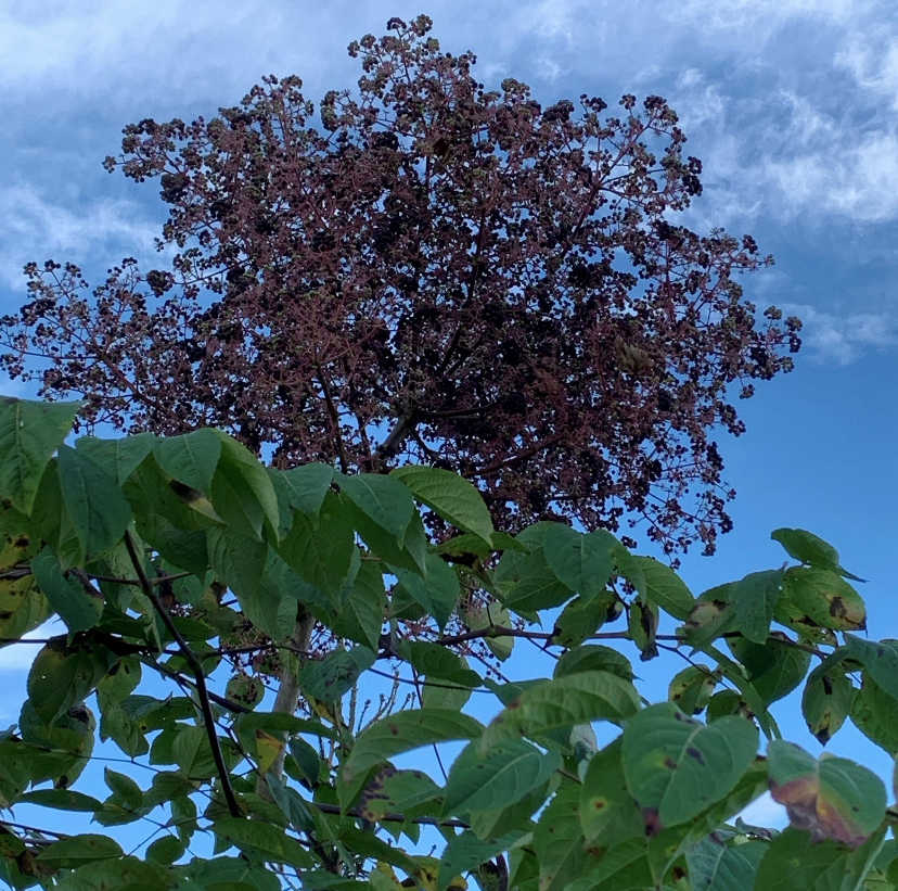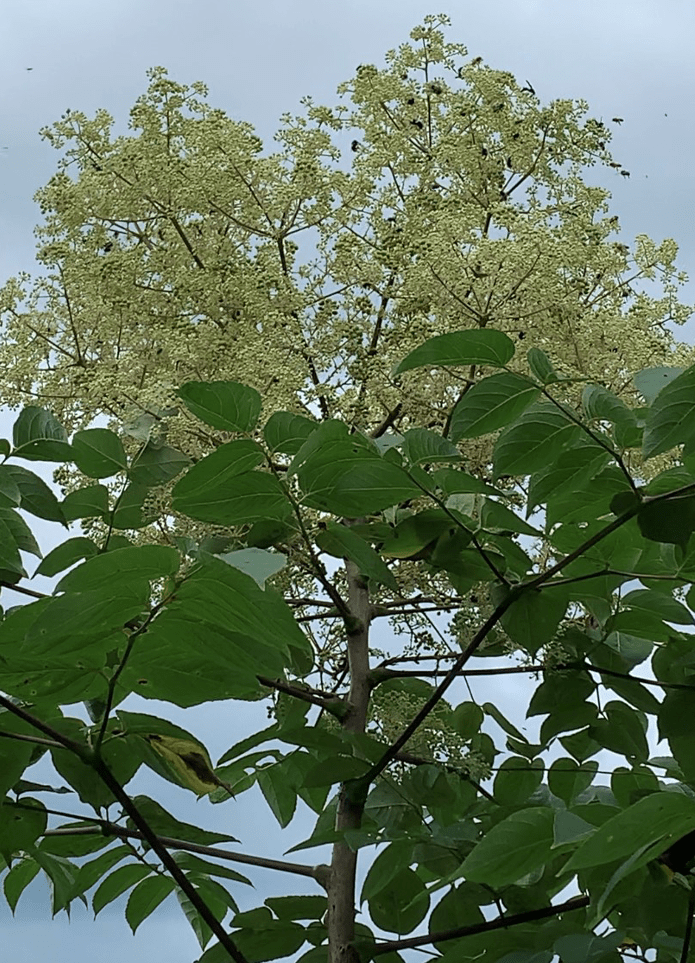 In Kentucky, it is found in moist or dry forests and along forest edges. That’s how I first discovered it out in nature. They were growing along a forest edge where I mistook them for elderberries. Their blooms are somewhat reminiscent of elderberry (albeit the timing is off). The small individual flowers form large terminal panicles in July-August. Bees and many other pollinators are highly attracted to them.